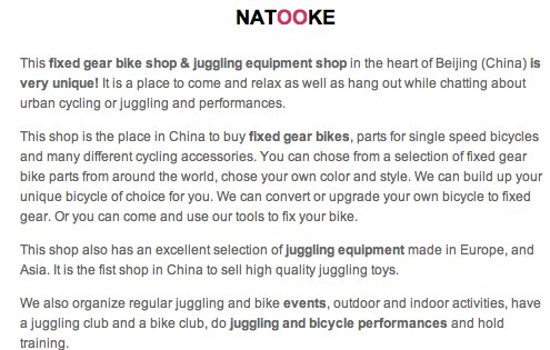 伊泉:这个商店分两个部分,一部分是售卖杂技用品,有很全的杂技装备。另一部分当然就是自行车了,现在我们只有Fixed Gear,以后我们有可能引进 单速车。此外,我个人偏爱古老的款式,这些老车子无论设计还是做工都很棒。和现在生产线大批量生产的自行车相比,这些老家伙更具魅力,所以我们也经营这类 车子。
